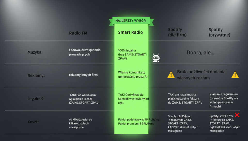 Wielu przedsiębiorców obawia się kontroli organizacji takich jak ZAIKS czy STOART. Wybierając Smart Radio, otrzymujesz: