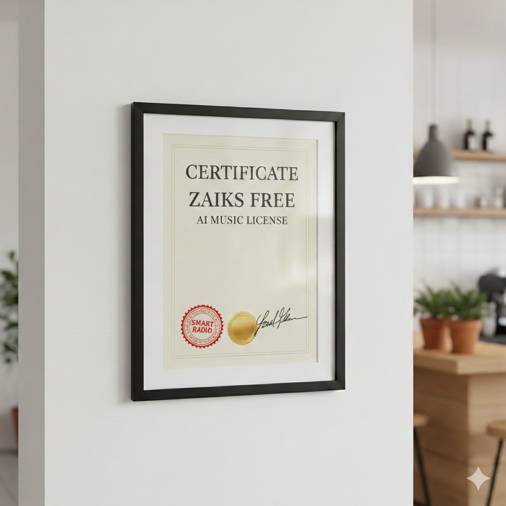 Imienny Certyfikat Legalności: Po aktywacji subskrypcji otrzymasz dokument potwierdzający, że muzyka w Twoim lokalu jest generowana przez AI i jest wolna od opłat na rzecz OZZ (Organizacji Zbiorowego Zarządzania), takich jak ZAIKS czy STOART.